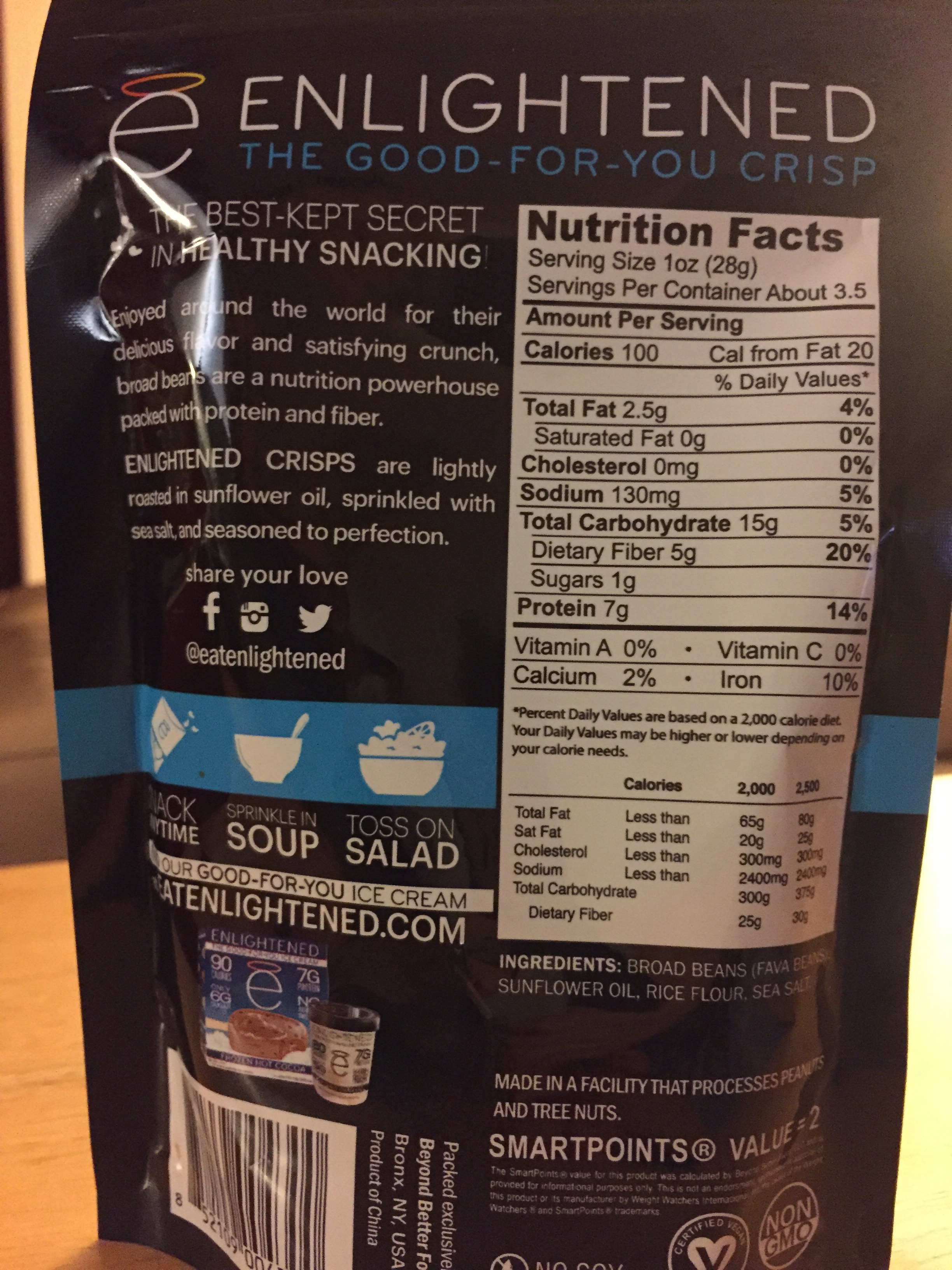 I was walking down the cracker and nuts aisle and came across a small bag of roasted broad beans by Enlightened. I had eaten roasted broad beans before but not this brand. I turned the label over(because I always read the label) to look at the ingredients and nutrional information. I was surprised to see that this snack food packs a whopping 10% iron, which I seem to run low on at times, 5 grams fiber, 7 grams protein,only 2.5 grams of fat, and 0 Saturated fat. A serving is around an ounce and only 100 calories.