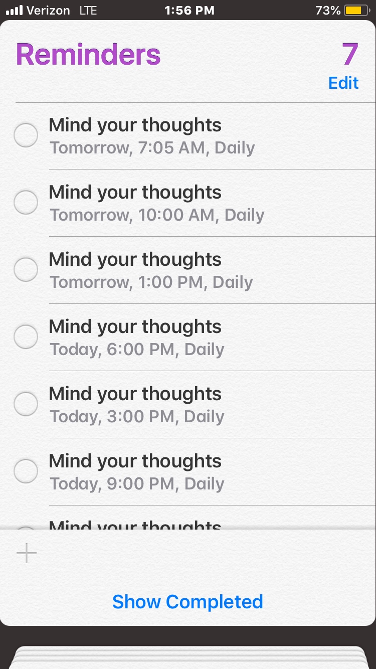 Pick a mantra that you like. My personal mantra is “Mind your thoughts”. I have my reminder app set to go off every 2 hours upon wakening up until bedtime. You can set it to as many times as you feel you need it.