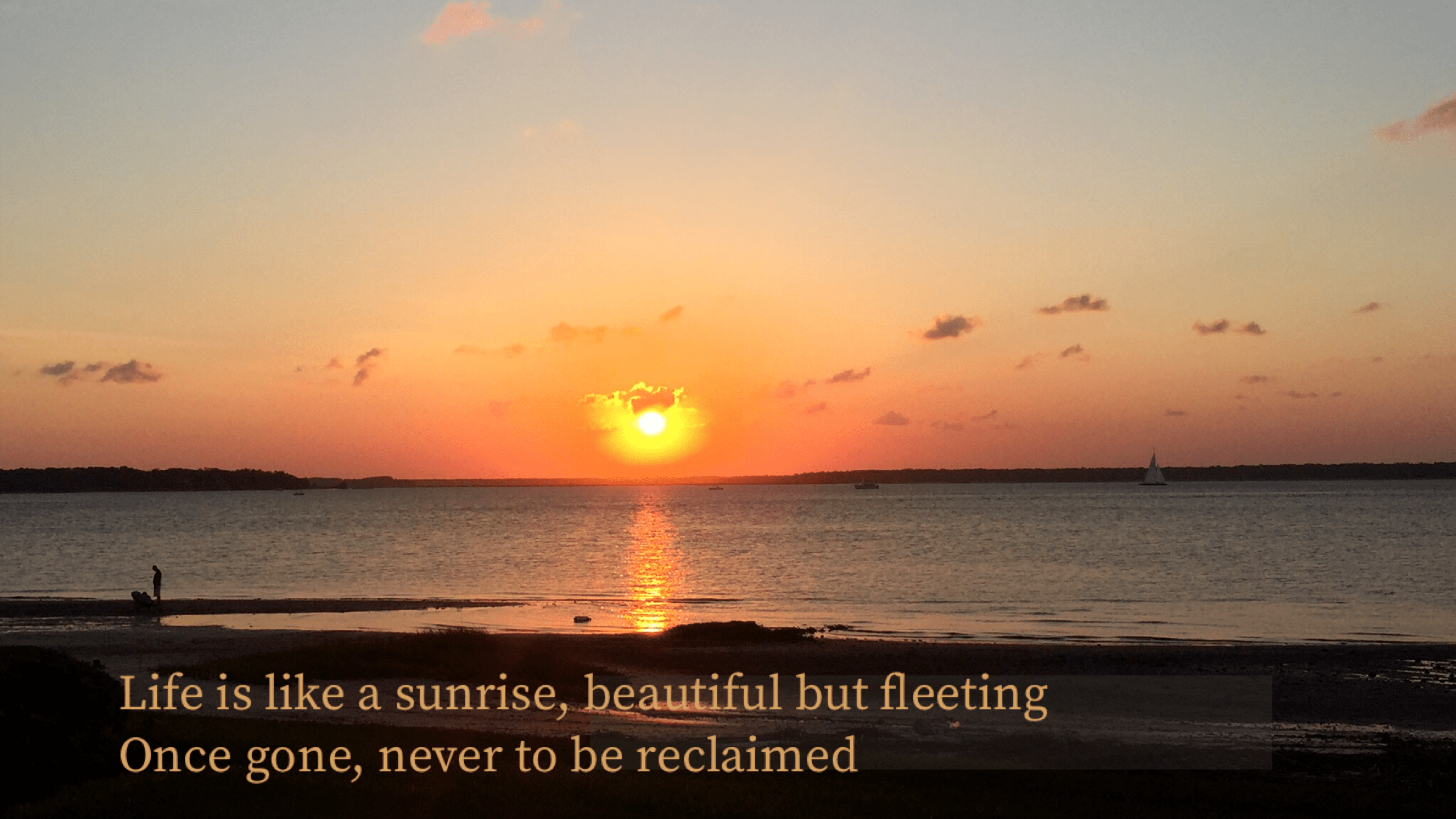 Life is like a beautiful sunrise. It is fleeting and once it is gone, never to be reclaimed. Just like the sunrise, life is temporary and beautiful and waits for no one. Make time for pauses in your routine to enjoy the simple, beautiful pleasures life has to offer, and then give thanks for life’s splendor!