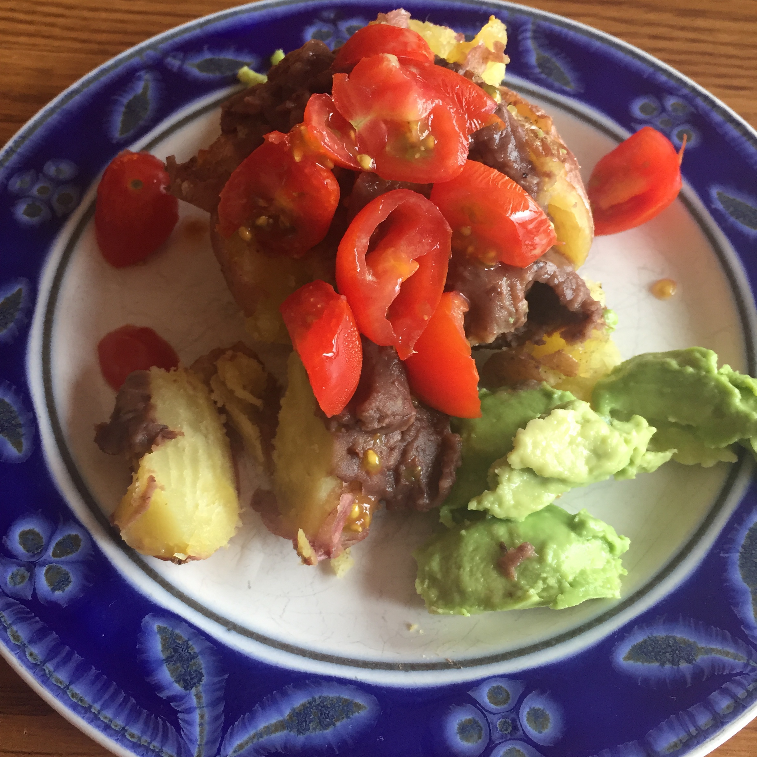 - Top potatoes with avocado slices, tomatoes