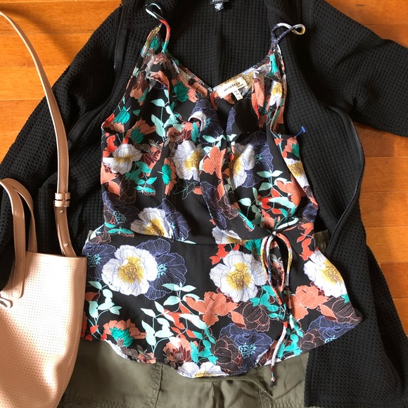 This beautiful, preloved faux wrap camisole with spaghetti straps will liven up any outfit with its bright, floral design and feminine ruffles.