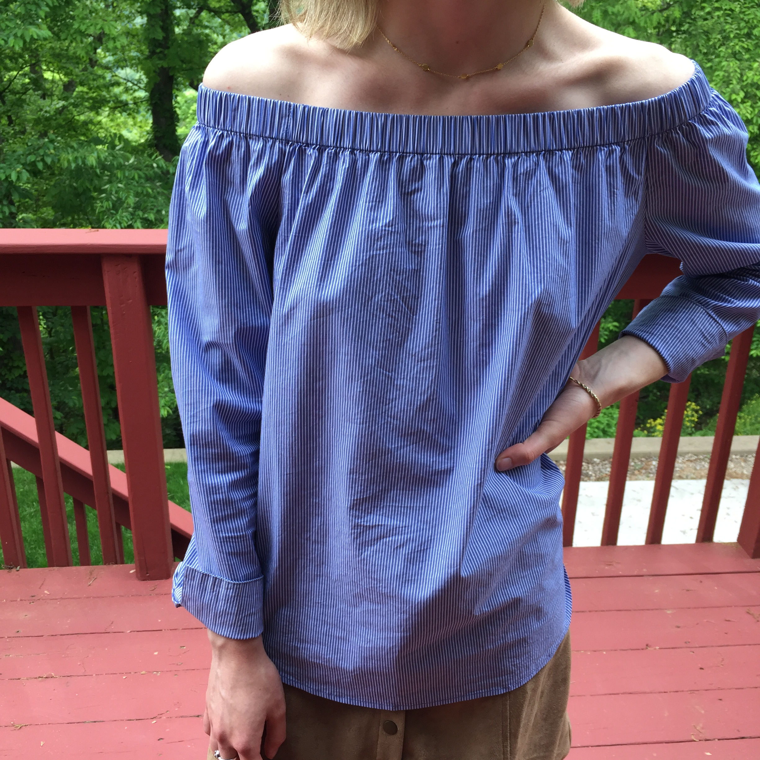 We just added this beautiful, crisp, blue and white, pinstriped, bare-shoulders, flowy blouse to our on-line store.