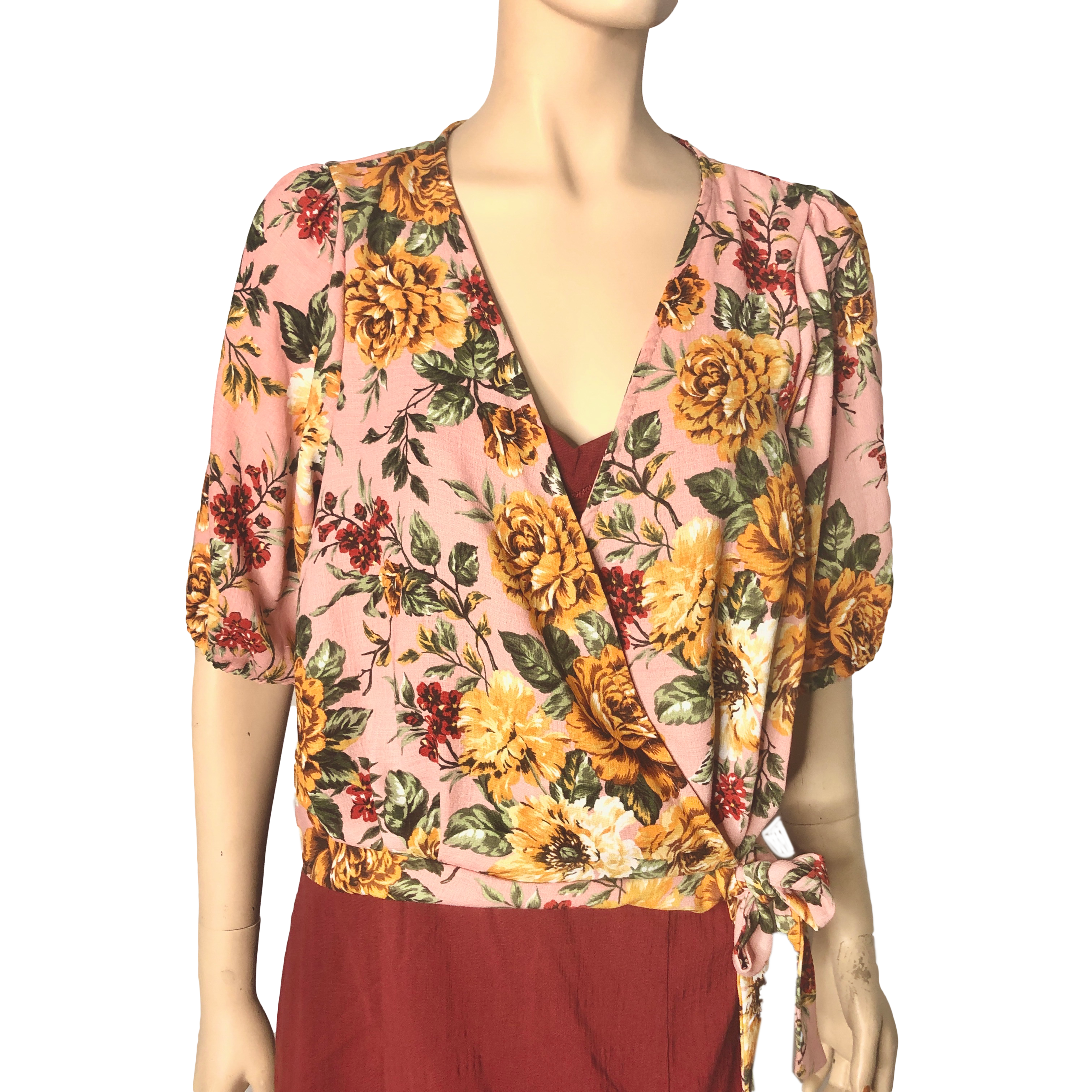 Update your look with this floral, faux wrap, 3/4 sleeves blouse by Xhiliration