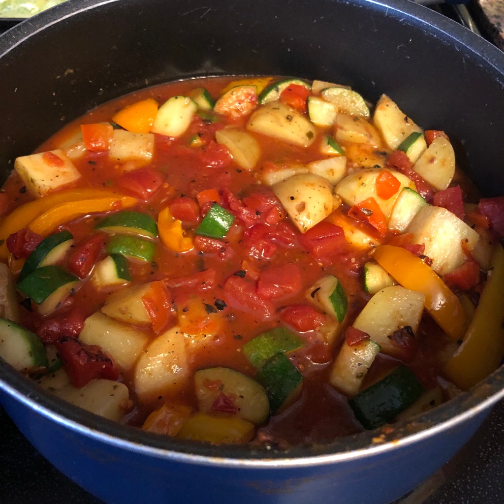 I’m not sure what to call this delicious Italian vegetable soup, so feel free to offer some suggestions. It has basically 4 main ingredients: zucchini, tomatoes, potatoes, and bell peppers.