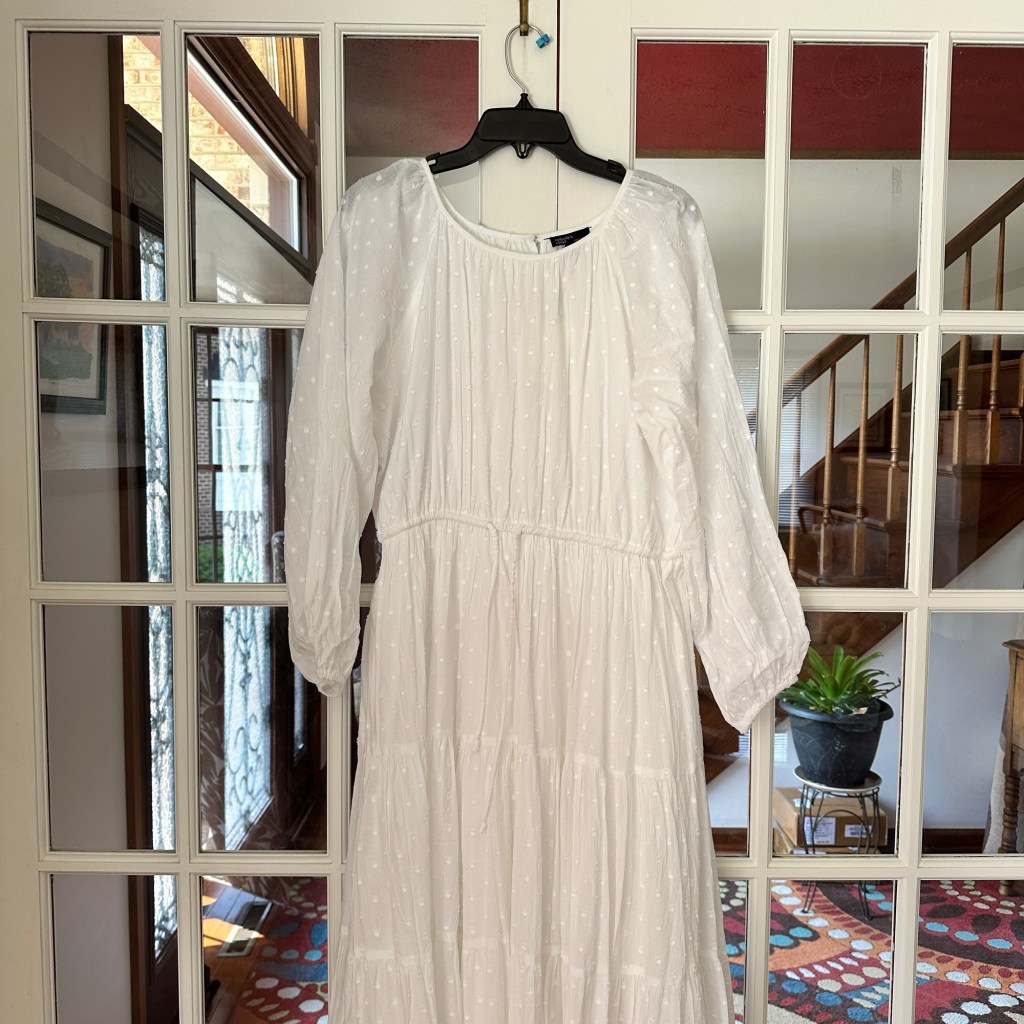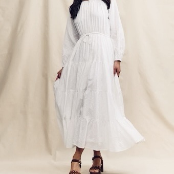 Crisp white with delicate embroidery Long sleeves with elastic cuffs Adjustable tie waist for a flattering fit Flowing tiered silhouette Fully lined and ready for any season NWT | $99 (originally $120)